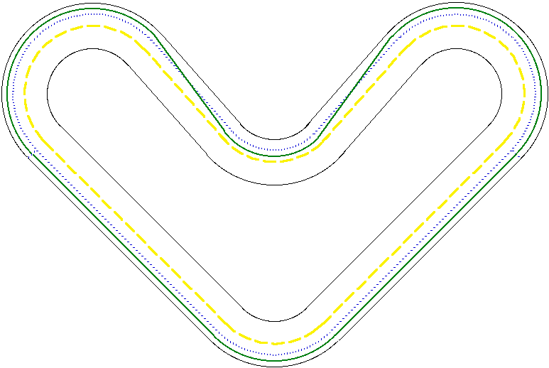 The sketch is obviously artificial: Curves are not constant radius and auto drivers hug the inside of a turn the same way motorcyclists do. That's good, it lets one find clean pavement a little away from the centerline on right-handers. On the lower part of the example it makes sense to shift closer to the centerline in the absence of opposing traffic, just to be a little away from the edge of the pavement, with its dogs, pedestrians, deer, parked cars and small children.